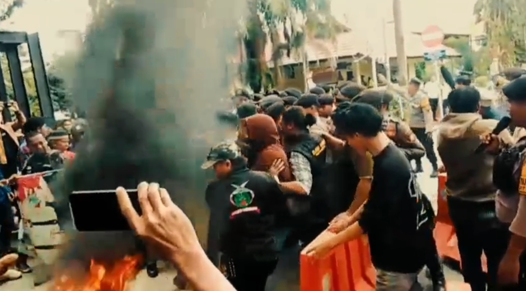 Aksi yang diikuti puluhan massa ini sempat berlangsung ricuh dan diwarnai pembakaran ban bekas yang memicu kepulan asap hitam di sekitar lokasi.