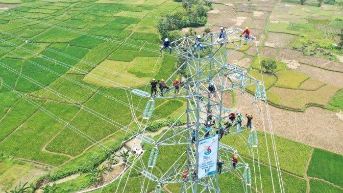 Sejumlah pegawai PLN UIP JBB melakukan pemasangan banner di atas ketinggian tower transmisi Saluran Udara Tegangan Tinggi (SUTT).