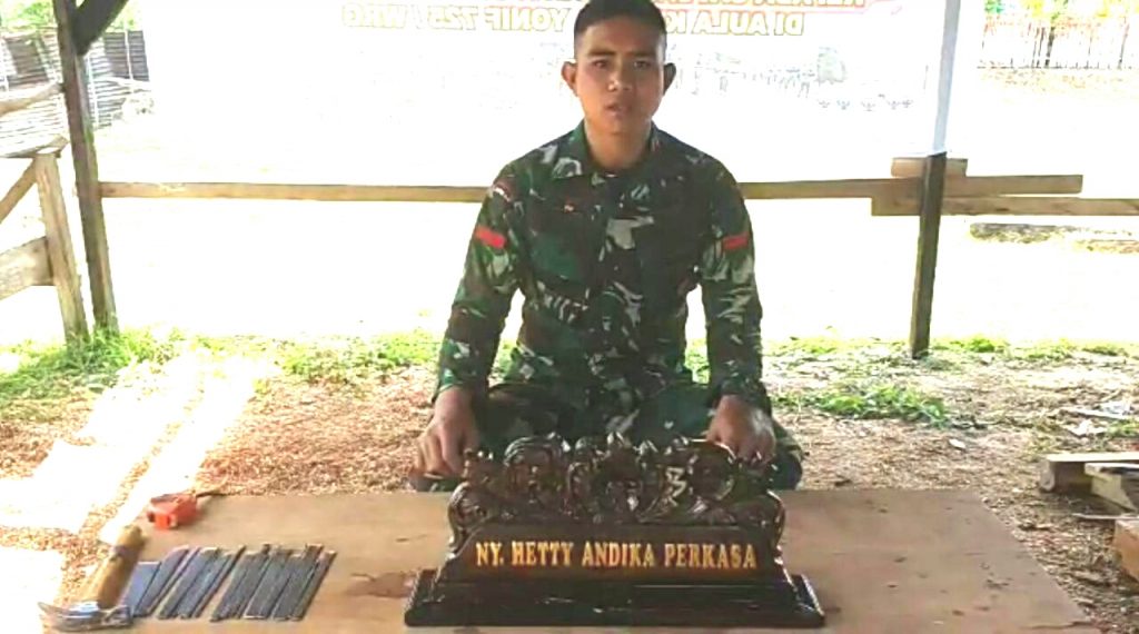 KONSEL,Beritakotaonline.id– Bertepatan hari ulang tahun Ibu Kasad, Ibu Hetty Andika Perkasa yang ke 49, Prajurit Satu I Made Arya Anggota Kipan A Yonif 725/Woroagi membuat ukiran papan nama yang berbahan dasar dari kayu sebagi kenang-kenangan.
