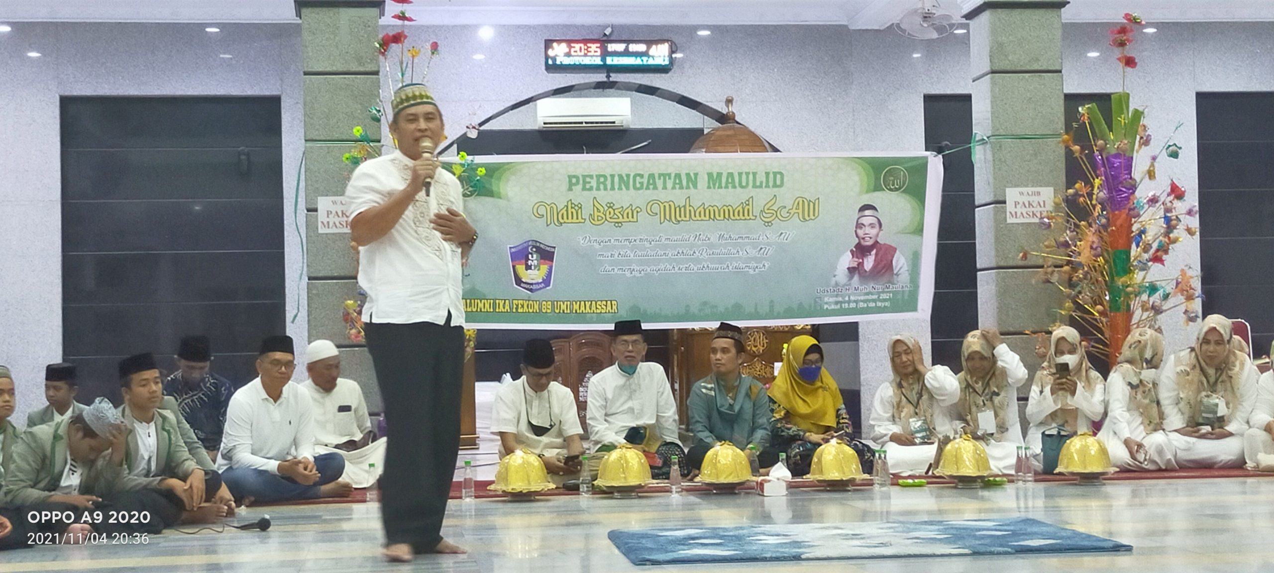 Makassar, Beritakota Online-Keluarga besar Ikatan Alumni (IKA) Universitas Muslim Indonesia (UMI) Makassar Fakultas Ekonomi Angkatan 89 menggelar peringatan Maulid Nabi Besar Muhammad SAW 1443 Hijriah, Kamis (5/11/2021) dan merupakan kegiatan rutin yang digelar setiap tahun di Ika Fekom 89 UMI Makassar di Masjid Taqwa Jl Dr Wahidin Sudirohusodo Makassar.