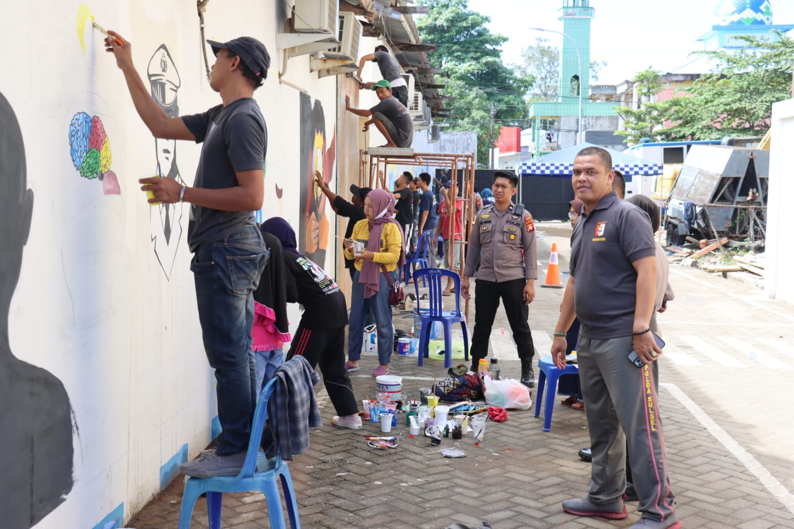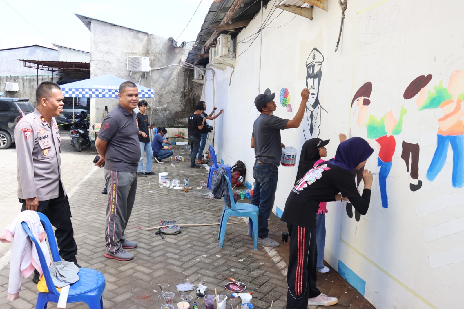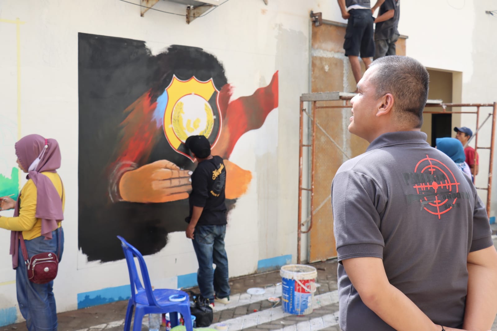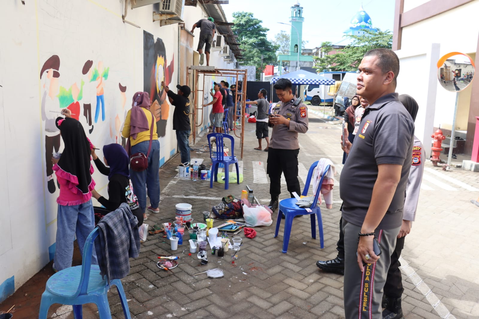 Tampak Kapolres Gowa dengan antusias memperhatikan para seniman yang dengan penuh semangat melukis di tembok Kantor Polres Gowa.