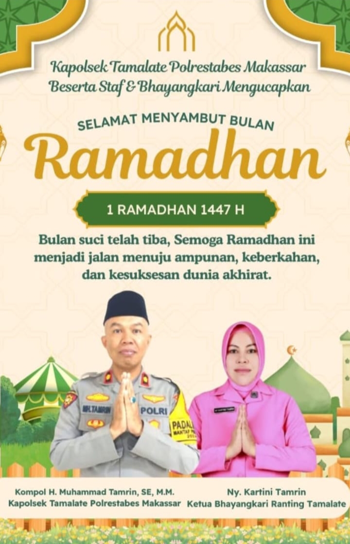 “Atas nama pribadi dan keluarga besar Polsek Tamalate, kami mengucapkan selamat menjalankan ibadah puasa Ramadhan 1447 Hijriah. Semoga bulan suci ini membawa keberkahan, kedamaian, dan ampunan bagi kita semua,” ujar Kompol H. Muhammad Tamrin, Rabu.