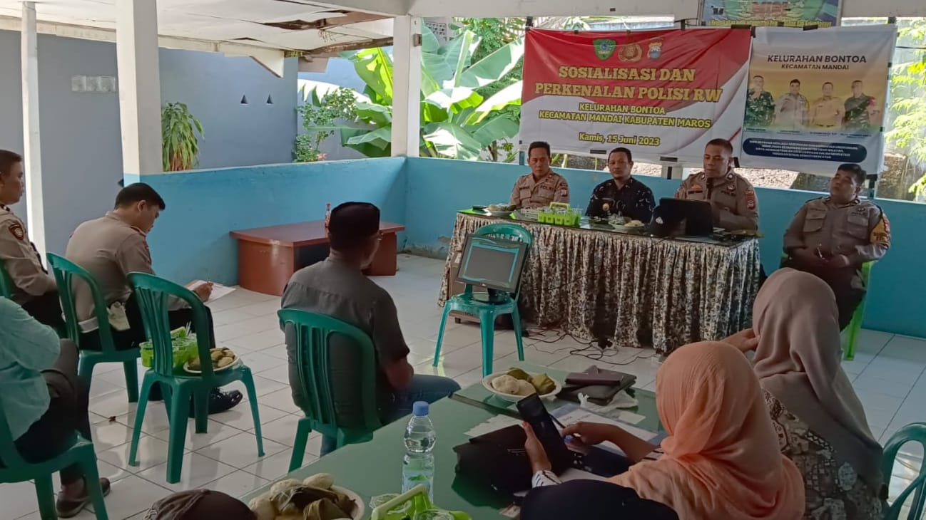 Maros , Beritakotaonline-Polsek Mandai bersama jajaran Kelurahan Bontoa Kecamatan Mandai Kabupaten Maros menggelar sosialisasi dan perkenalan Polisi RW di Aula Kantor Lurah Bontoa Mandai, Kamis 15 Juni 2023.