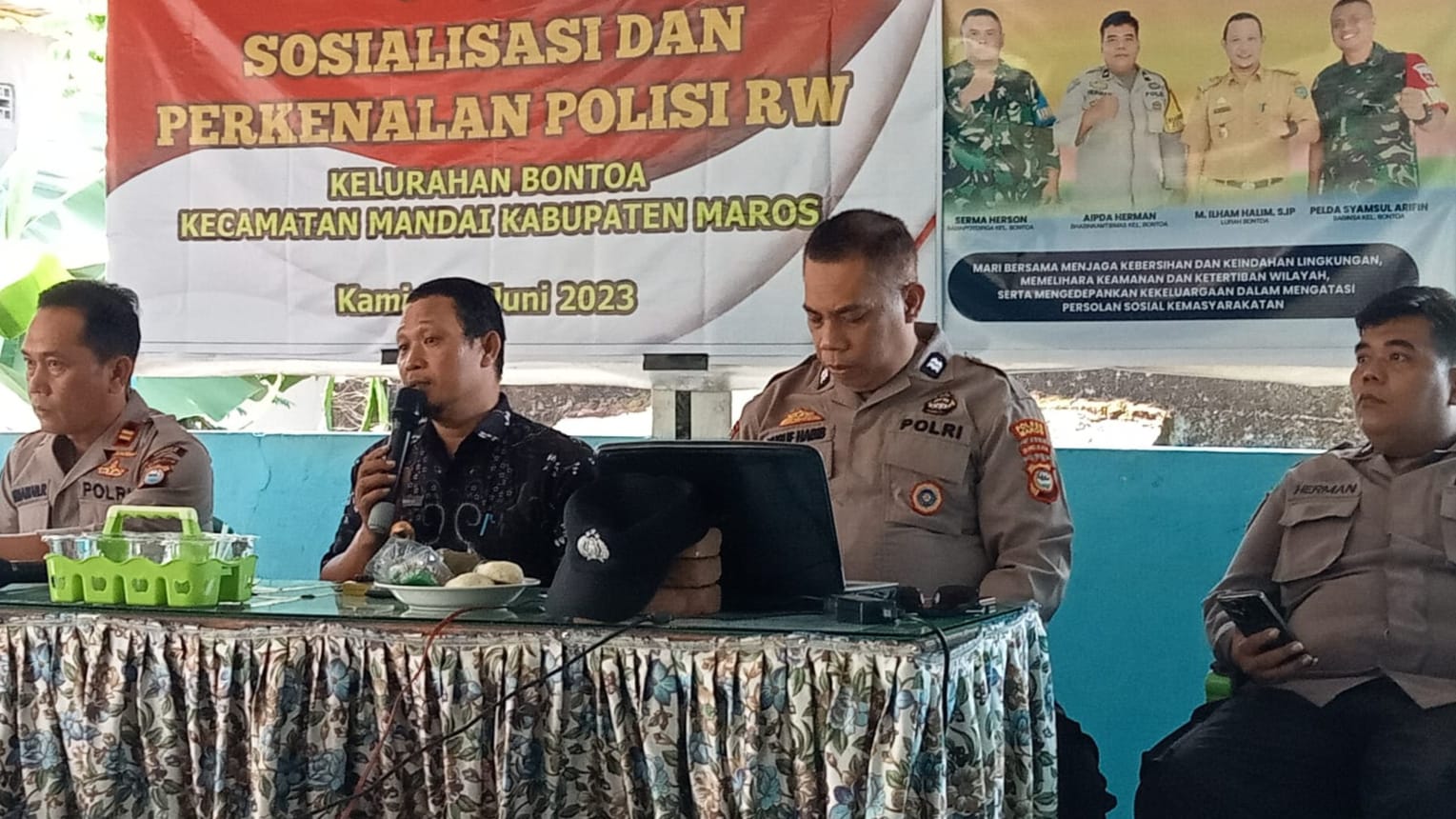Maros , Beritakotaonline-Polsek Mandai bersama jajaran Kelurahan Bontoa Kecamatan Mandai Kabupaten Maros menggelar sosialisasi dan perkenalan Polisi RW di Aula Kantor Lurah Bontoa Mandai, Kamis 15 Juni 2023.