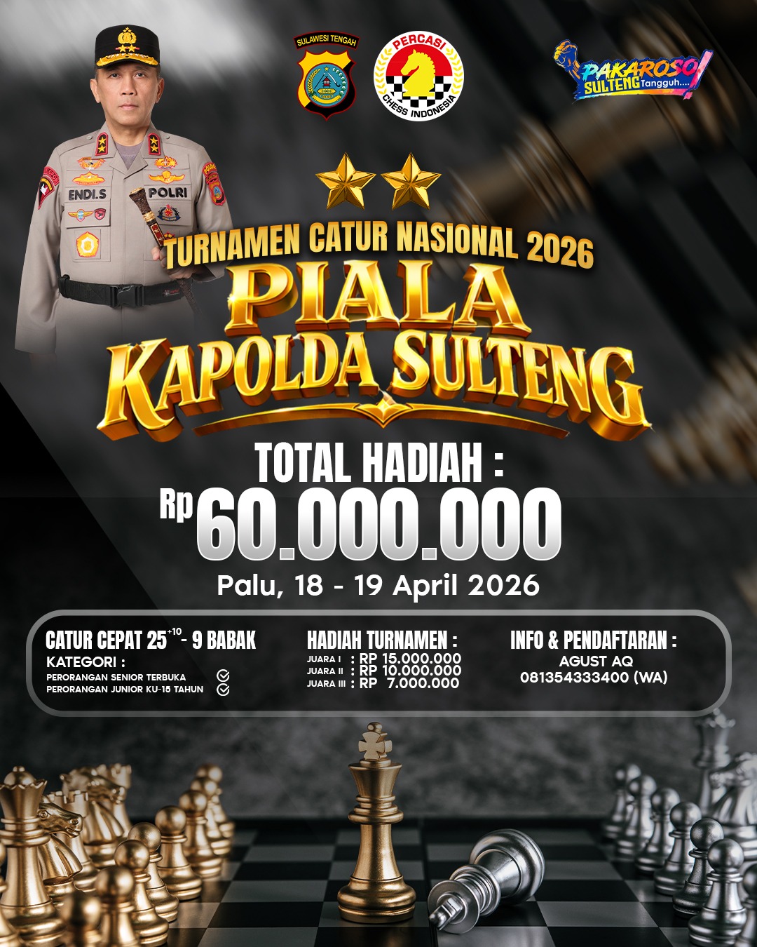 Lebih lanjut, Kabidhumas mengajak seluruh masyarakat, khususnya pecatur di Sulawesi Tengah dan sekitarnya, untuk turut berpartisipasi dalam turnamen tersebut.