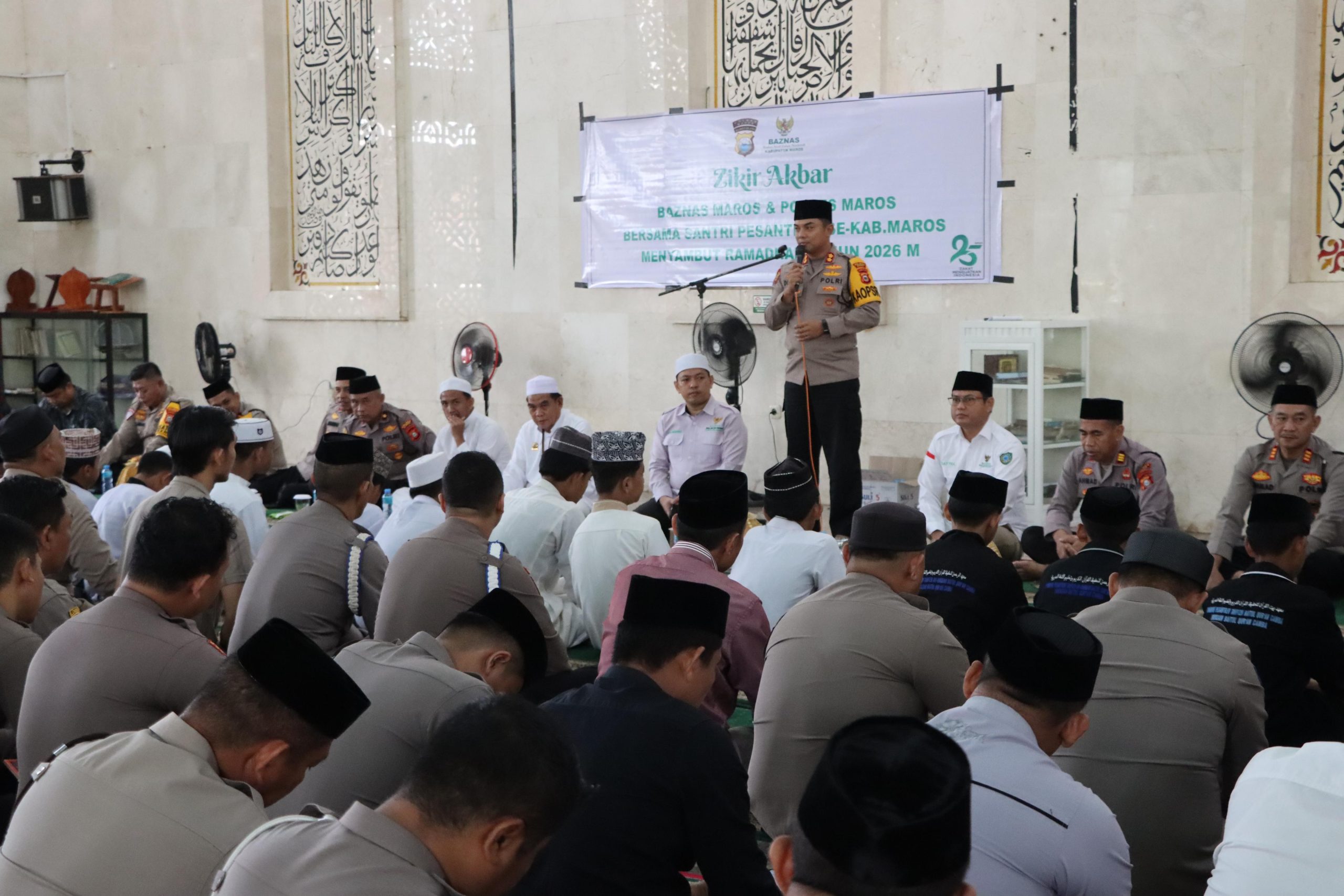 Kegiatan yang berlangsung khidmat tersebut dihadiri oleh jajaran Polres Maros, Pengurus Baznas Maros,serta perwakilan santri dari 25 pesantren yang ada di wilayah Kabupaten Maros. Suasana religius dan penuh kekhusyukan terasa saat lantunan zikir dan doa bersama dipanjatkan sebagai bentuk rasa syukur sekaligus memohon keberkahan menjelang Ramadhan.