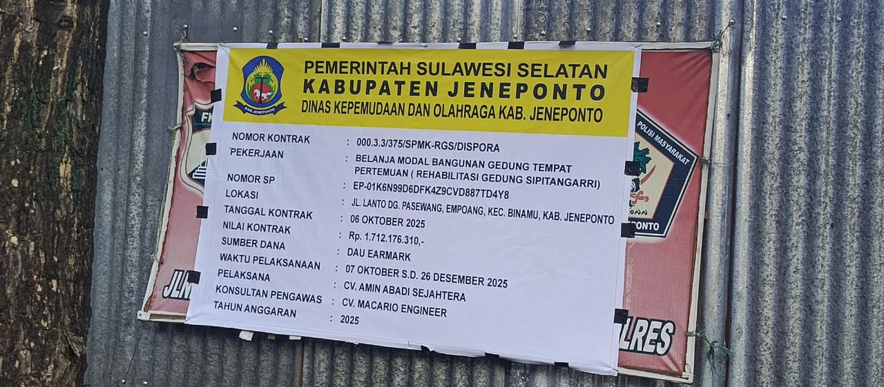 Proyek yang bersumber dari Dana DAU Earmark Tahun Anggaran 2025 ini dikelola oleh Dinas Kepemudaan dan Olahraga Jeneponto melalui paket belanja modal bangunan gedung tempat pertemuan.