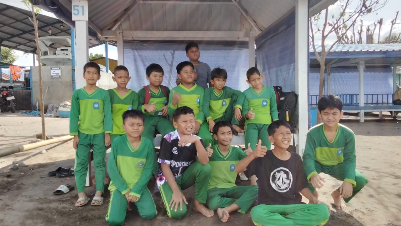 Siswa MI Al-Bashirah bersama guru berpose ceria usai mengikuti rangkaian rihlah edukatif di Pantai Biru Metro, Makassar, Ahad (23/11/2025) (Foto: Istimewa).